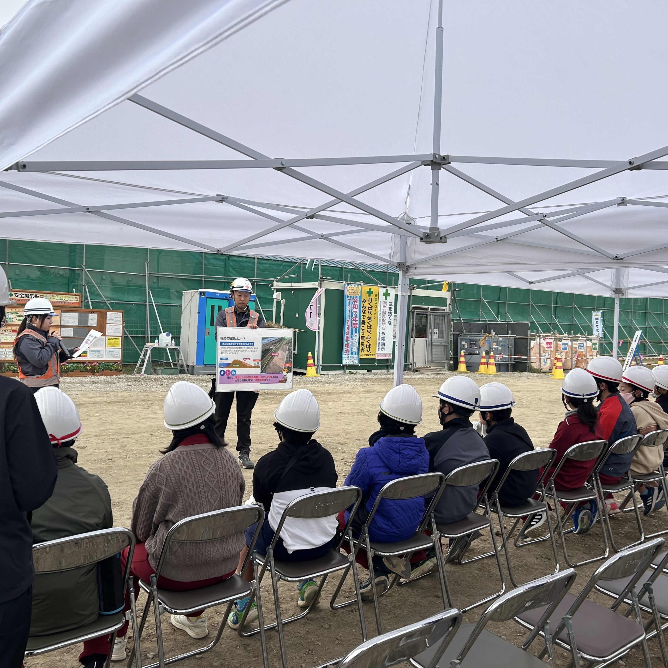 土木事業部の堤防強化工事の現場にて、川俣小学校の児童の皆さんを対象に現場見学会を開催しました。